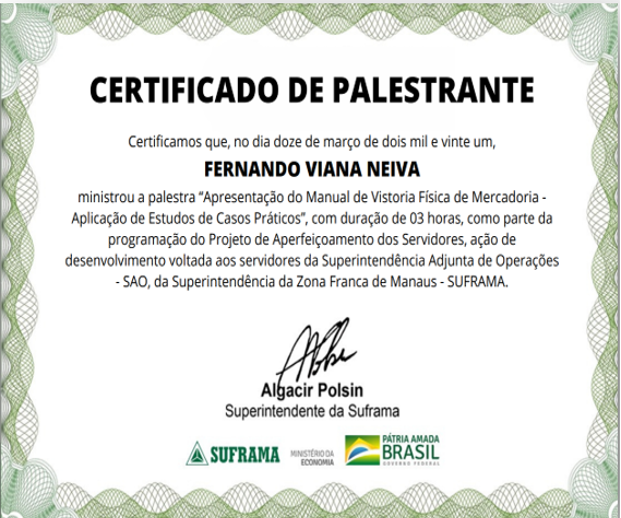 - Instrutor de cursos de vistorias físicas para os vistoriadores da Suframa;